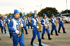 为这支游行队伍开道的“亚洲天国乐团”让观众惊羡不已,沿途观众争相拍照并与乐团合影。“亚太天国乐团”的一百六十名成员大多是来自台湾、日本、新加坡、韩国等地的华裔法轮功学员。台湾天国乐团负责人洪尧纹表示,台湾天国乐团成立两年,有五百多成员,这次来了四十名团员。