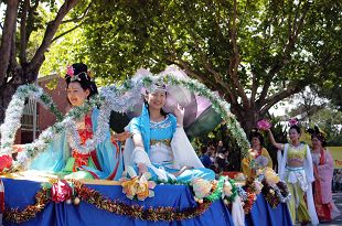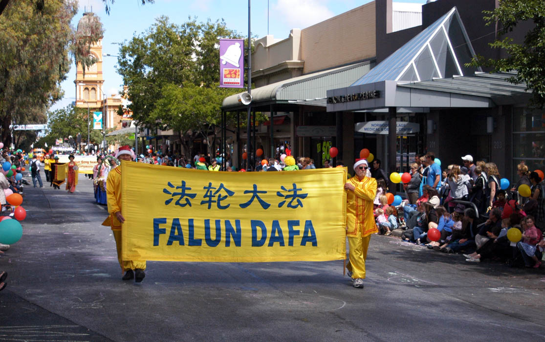 这一天,碧空如洗,阳光明媚。来自印度、朝鲜、日本等不同种族、不同文化背景的八十三个团体参加了本次游行。风格各异的民族节日服装,传统而欢快的乐曲,为“节日之都”阿德雷德尽情渲染着圣诞色彩。南澳法轮大法学员组成的方队是游行队伍中一个宁静的亮点。祥和的音乐中,绽放的莲花,端庄贵气、色彩艳丽的唐代服饰表演和身着飞天服装的学员功法展示,受到了在场观众的喜爱。当一位市民看到学员手中的横幅“世界需要真、善、忍”时,向学员们频频点头说:“是的,是这样的!你们非常出色!”
