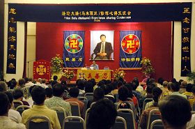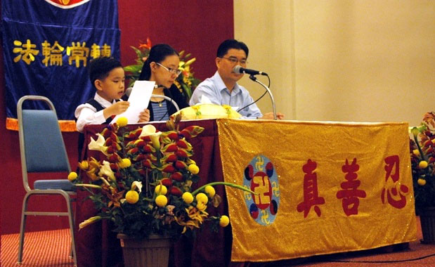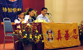 来自槟城的罗先生一家三口上台交流了大法如何改变了他的家庭。在他修炼了法轮大法数月后,很神奇的是几年来超高的肝功能指数(SGPT)竟然从146 IU/L回降到正常的指数40 IU/L。罗太太交流了她在修心又炼功的过程中如何体现在工作上。她的上司发现她对工作自动自发与勤劳,这时也捎来了一个好消息,就是她梦寐以求的硕士课程被批准了,公司将会付全部的学费与书籍费用让她進修。但是她还是拒绝了,因为她想让其他同事有机会去。此外,他们七岁的孩子修炼大法已经两年多了,他也知道法轮大法叫人修“真、善、忍”。他说:“如果我欺负朋友,我白色的德就给了他们。自己身体却有了黑色的业力。我希望自己能常常记得‘真、善、忍’。”