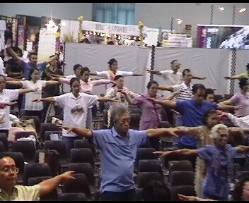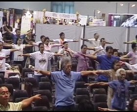 法轮功学员还应会方邀请,在主会场大厅举办法轮功专题讲座。在学员的讲解示范下,全体观众伴随优美的炼功音乐现场学炼五套功法,把会场气氛推至高潮。