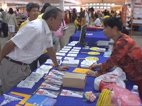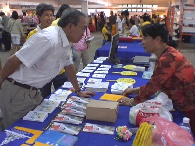 一年一度的泰国精神科学博览会吸引了各地观众,人们来此获取各种资讯,听取演讲。法轮功学员在展位布置了「真善忍美展」,播放大法音乐,摆放了多语种大法资料、真相光碟,以及莲花、书签、扇子等赠品,吸引了人们的注意。