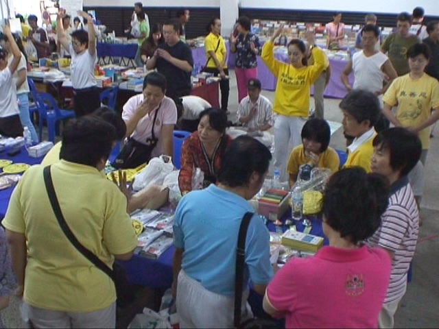 学员向观看画展的观众讲解每幅画的内容,并在现场热情教功。很多有缘人当场学功,其中有年届花甲的老人、天真的孩童,以及僧人、警察等。前来展位的人络绎不绝,有的购买《转法轮》,有的索要大法资料,学员们一边洪法教功,一边向民众揭露在中国大陆中共对法轮功的残酷迫害。明白了真相的人,有的主动留下了自己的联系方式,表达了对法轮功的支持和关注。