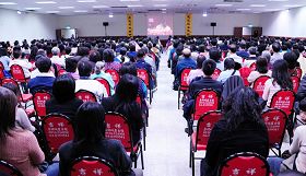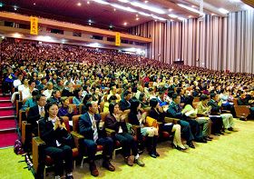 天刚亮,上百部来自全台各地的游览车和小客车就陆续驶进中兴大学,他们着盛装、俩俩相偕走进会场。除了安排主会场--惠荪堂外,另有五处副厅,以容纳庞大数量的学员。会场大厅中心挂着金字红底的《论语》的巨大横幅,两旁则是绿、橘、紫、黄、蓝底色的“法轮图形”横幅,会场内神圣庄严而隆重。