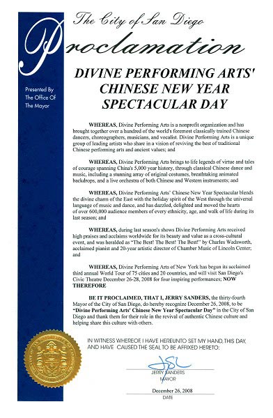 圣地亚哥市长杰瑞·桑德斯发布嘉奖令,将晚会开演的第一天二零零八年十二月二十六日定为“神韵新年晚会日”。