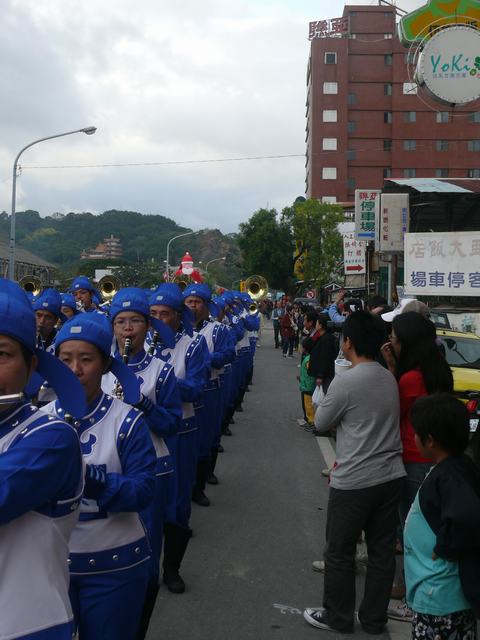 天国乐团一百五十位团员穿着蓝白相间的中华传统古装登场,把法轮大法的祥和与美好,传送给道路两旁热情观赏的民众。队伍后面是由九位仙女组成的仙女队,穿着富丽典雅唐装的仙女们,沿路分送一朵朵系着「法轮大法好」书签的莲花,民众争相索取,露出开心的笑容。五十位由屏东和台东法轮功学员组成的「天威唐鼓队」,精神抖擞的演出,赢得沿途民众热烈掌声。