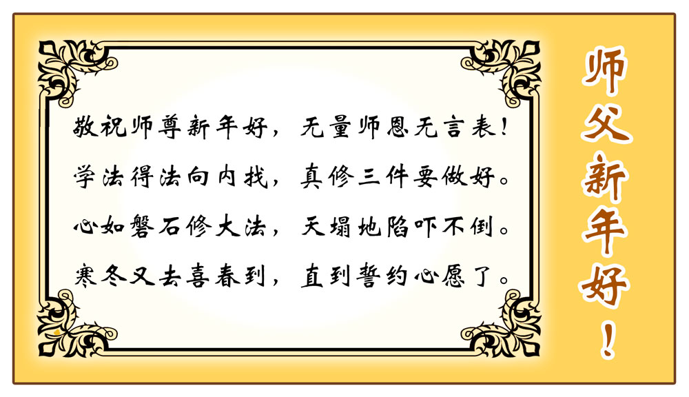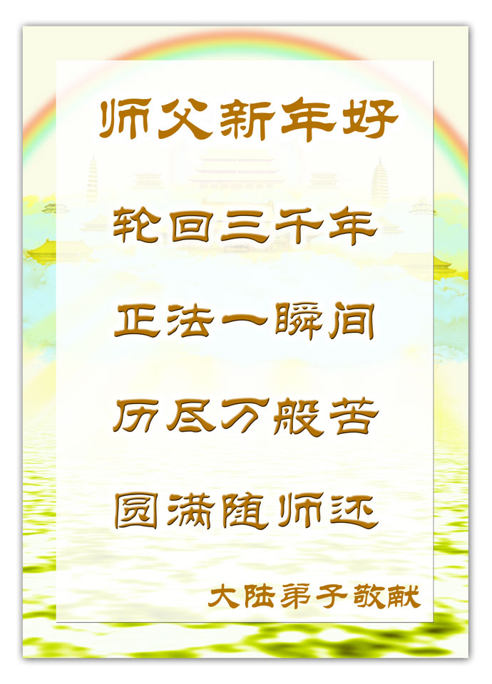 请师父放心,在新的一年里,我们定会在您急切呼唤“时间不等人”的洪声法鼓中奋進!抓住这星日轮转、值千金万金、稍纵即逝、救人于水火之中的最后时刻,使自身每个细胞从洪观到微观都溶于大法中,在加紧学法中充实正念,并在无条件内找中,修去一切不正,使心灵在不断洗净中升华。心怀大法与众生,紧跟正法進程,与全球同修携手共進,坦荡助师正法,救度更多众生。当走过这万古难逢、今后永远不会再有的正法史程,回过头来看,不汗颜、不内疚、不遗憾、不负众望,才能向伟大师尊交上合格答卷、才能无愧于师尊的慈悲苦度与浩瀚洪恩、才能堂堂正正的如意随师凯旋归航!