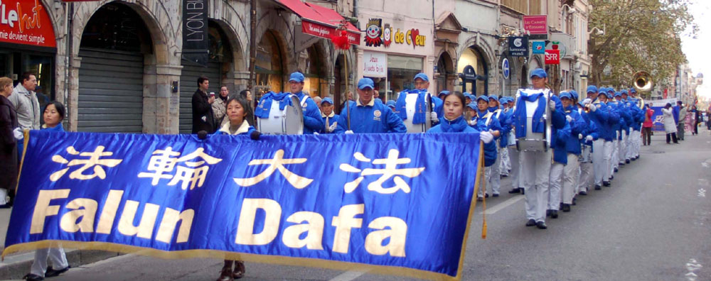 接着,由欧洲天国乐团开道,紧随其后的是由法轮功学员和有关人权团体组成的游行队伍。他们沿着里昂市的共和国大道(Rue de la République)到达共和国广场(Place de la République),经由雅各宾广场(Place des Jacobins),穿过闹市区(Rue Edouard Herriot),最后到达里昂市政府所在地的特鲁广场(Place des Terreau)。