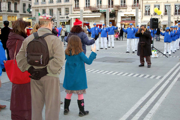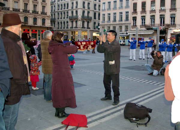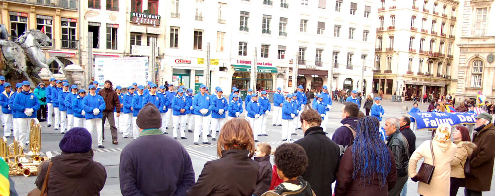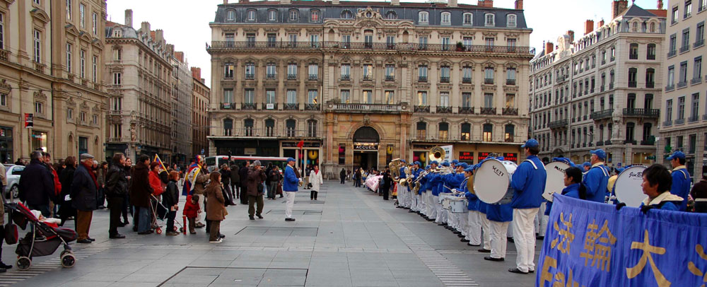 集会是在原定召开欧中峰会的里昂市喜剧广场开始。首先欧洲“天国乐团”在广场上演奏“法轮大法好”等几首歌曲,围观的民众逐渐增多。