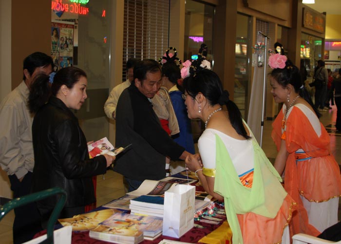 一位前几天在另一购物中心新唐人展示台前知道神韵在达演出消息的越裔男士,看到这里也有神韵演出的信息,高兴的对学员说:“我上次知道后就去网上看了,已经为我和太太及朋友订好了五张票!我们非常期待!”