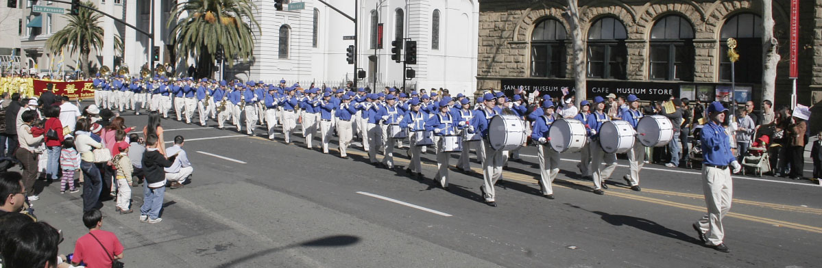 法轮功队伍以浩荡的天国乐团开路,蓝帽、蓝衣、白裤,乐团的队员们个个精神抖擞,充满朝气,《法轮大法好》、《美丽的美利坚》、《法正乾坤》、《法鼓法号震十方》,雄壮的乐曲冲击着众生的心灵。紧接着的法轮功炼功队伍,为现场带来一片祥和。
