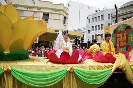 游行过程中,法轮功学员组成的天国乐团演奏了“法轮大法好”等乐曲,给观众们带来耳目一新的感受。天国乐团后面是色彩鲜艳亮丽的莲花花车。鲜艳盛开的莲花中,坐着圣洁优美的仙女,身着金色服装的法轮功学员安详微笑的坐在莲花中,展现着修炼者“出淤泥而不染”的品格。