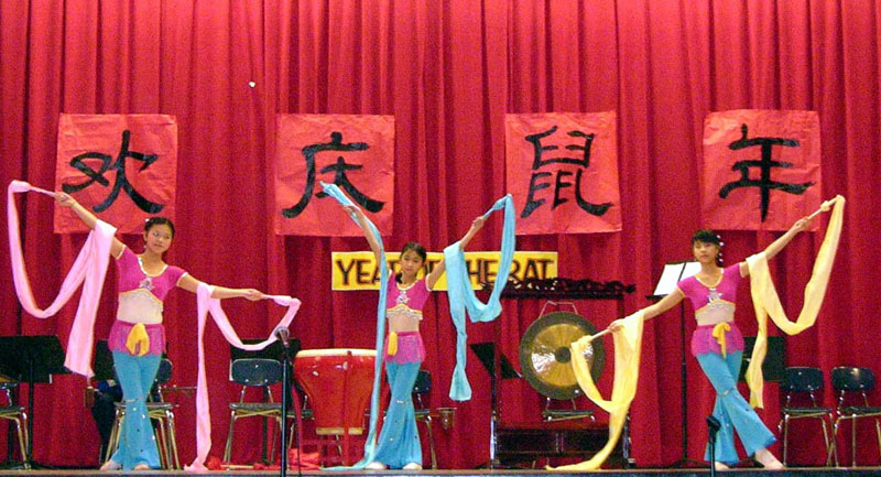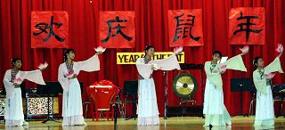 大年初一是星期三。清晨,三位法轮功学员领着几位明慧学校的小弟子赶到了麦考学校。一进校门,好几个西方的老师和一大帮学生笑盈盈的走来,并带学员们到演出的场地。一路上,他们不停地称赞法轮功小弟子很可爱、演出服装很美丽。