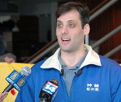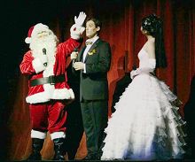 ![]() 零六年新唐人圣诞晚会上,圣诞老人送给林理善说中文的能力 |