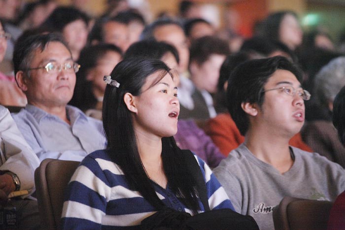 三月九日台中首场的观众看到神韵晚会节目剧情紧张时刻的表情