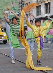 ![]() 法轮功的美西天国乐团受人瞩目,雄壮的军乐震撼人心。 |