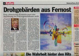 《慕尼黑日报》在三月二十日题为“来自远东的威胁”的报导中揭露中领馆对当地演出公司施压,妄图阻止神韵晚会上演。