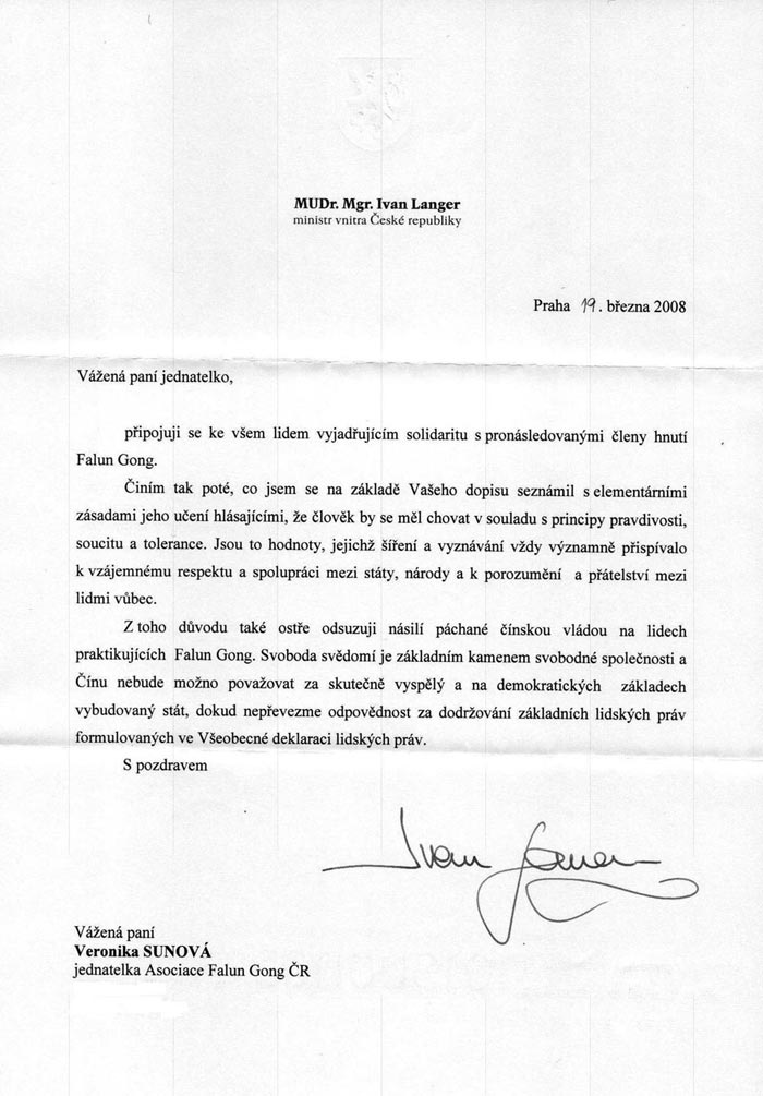 在您的来信基础上,了解到法轮功的基本原则,即人的行为应该符合“真、善、忍”后,我决定表示声援。对这“真、善、忍”价值观的传播和信仰总是能够对国家、民族之间的相互尊重和合作以及人们的彼此理解和友好产生深远的积极影响。