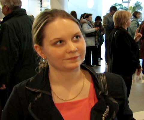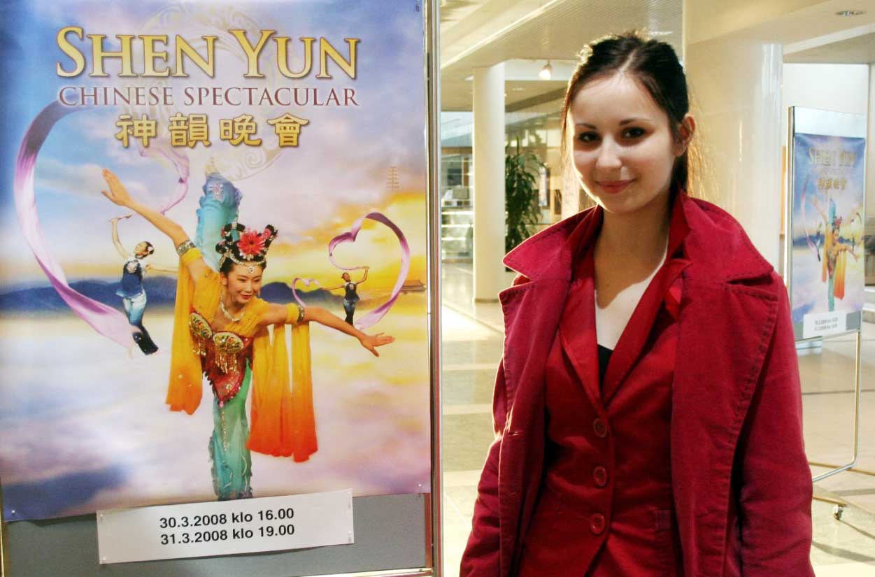 阿丽娜(Alina)今年十八岁,来自俄罗斯圣彼德堡,从小就喜欢跳舞,曾经在俄罗斯著名的芭蕾舞蹈学校学习舞蹈九年,对舞蹈艺术有着很高的鉴赏力。三月三十日,她和妈妈、爷爷,奶奶乘了八个多小时的车,从圣彼德堡赶到芬兰的坦佩雷会议中心(Tampere-talo)看神韵在芬兰的首场演出。