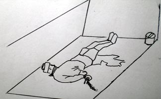 ![]() 棒子用布包上勒在嘴上“啃骨头” | ![]() 在严管队法轮功学员头被戴防撞墙帽、嘴被上“啃骨头”、手被反铐固定在地上、脚被死囚绳绑、身体在尿液中 |