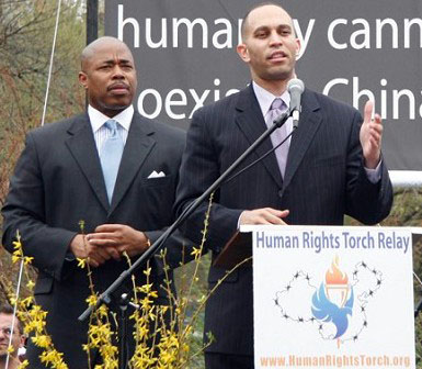 纽约众议员杰佛里斯在集会上发言:我和纽约州参议员亚当姆士计划起草一个立法条文,要求纽约州的资金投资不能流入到那些有人权恶行的国家去,我们需要确定钱和资金不会用在支持人权迫害的行为上……我们今天来到这里并不是反对商业交易,而是反对这种迫害人权的不公正行为。”