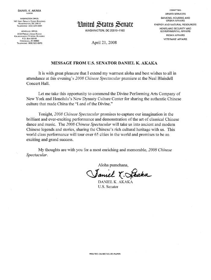 ![]() 夏威夷联邦参议员丹尼尔·阿卡卡祝福神韵晚会的贺信 |