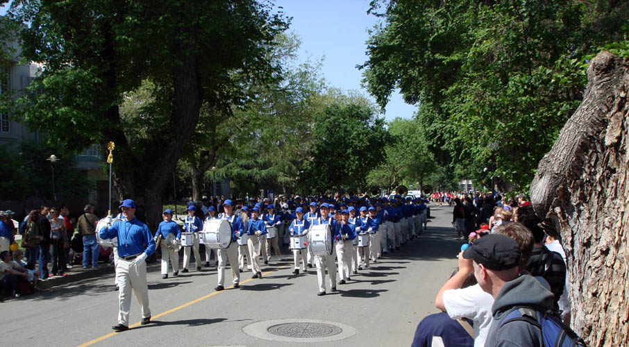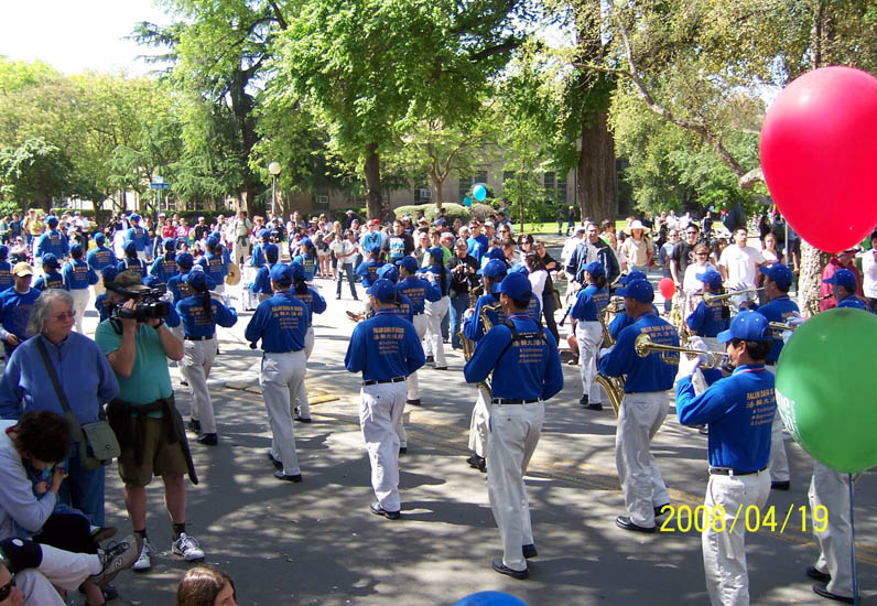 上午十点游行开始,在“法轮大法好”、“法正乾坤”等嘹亮的乐曲声中,身着印有“法轮大法、真善忍”的蓝色T恤,大部份由华人组成的“天国乐团”出现在人们面前;观众们或注目而视,或欢呼鼓掌,还有的挥手致意。“哇,法轮功还有军乐队?!”有中国人惊讶的脱口而出。