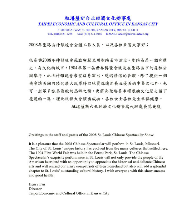 驻堪萨斯台北经济文化办事处代理处长范光复特地向神韵晚会全体工作人员以及来宾发来贺信,祝福大会演出成功,信中表示:“圣路易是一个有历史、有文化的城市,一九零四年第一届世界博览会就是在圣路易市的森林公园举行,此次神韵晚会来圣路易演出,透过精湛的表演,除了提供一个机会让美国内陆的广大民众得以欣赏源远流长及优美的中华文化外,也可一慰众多旅美侨胞的思乡之情,更将为圣路易市耀眼的文化历史留下亮丽的一篇。”