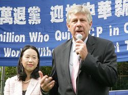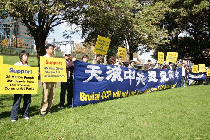 斯蒂文说:在过去三年的时间里,有三千五百多万中国人退出中国共产党、共青团和少先队,这是一个很大的数字,人们不能够忽略这个数字,这个数字将近是澳大利亚人口的两倍。从一九四九年以来,中共一直就有劳教所、死亡集中营,象二次世界大战德国希特勒一样迫害民众。比如,对法轮功的迫害,法轮功不属于任何的宗教或邪教,他们只是一群修炼真、善、忍的人,但是他们遭到虐杀,作为我个人,我觉得我有责任、有义务来制止在中国发生这样的事情,如果今天我不站在这里说话,我就有一种罪恶感。作为一个澳洲公民我今天站在这里,支持他们退党,我感到自豪。这里所有横幅都在传达一个信息,那就是结束中共这样的暴政。