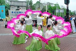 法轮功学员手持“法轮大法洪传世界十六载”、“法轮大法好”等横幅,传达了他们的心意,同时,学员们还向人们演示了法轮功功法;并表演了中国传统舞蹈“扇子舞”和“莲花舞”以赞颂法轮大法的美好。现场气氛充满祥和,观众发出阵阵掌声。