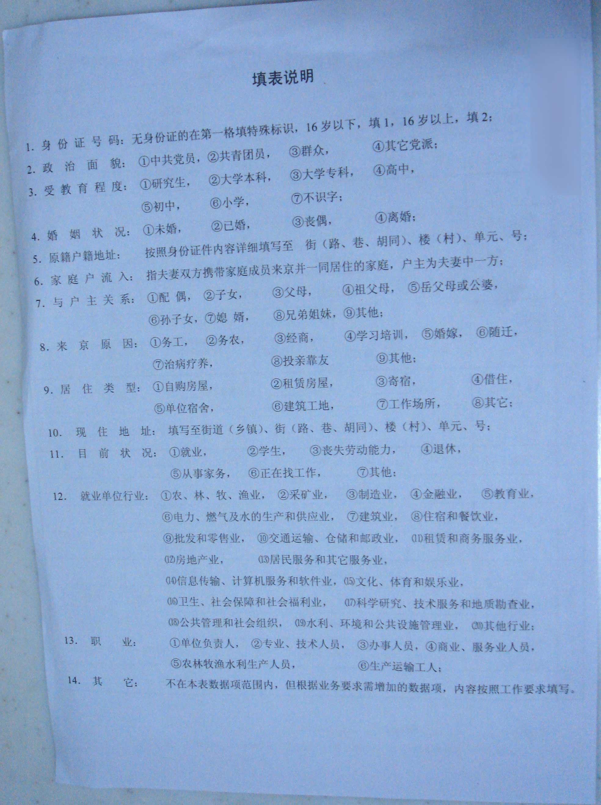 此统一由北京市流动人口管理办公室名义下达的《来京人员信息登记表》,所例条目繁多,被调查的学生除了对个人的情况须进行填写外,还必须将家里的其他人员所有情况进行填写,包括祖孙三代,邪党是要用这一毒招掌控外地在京民众,以利于它进行迫害。