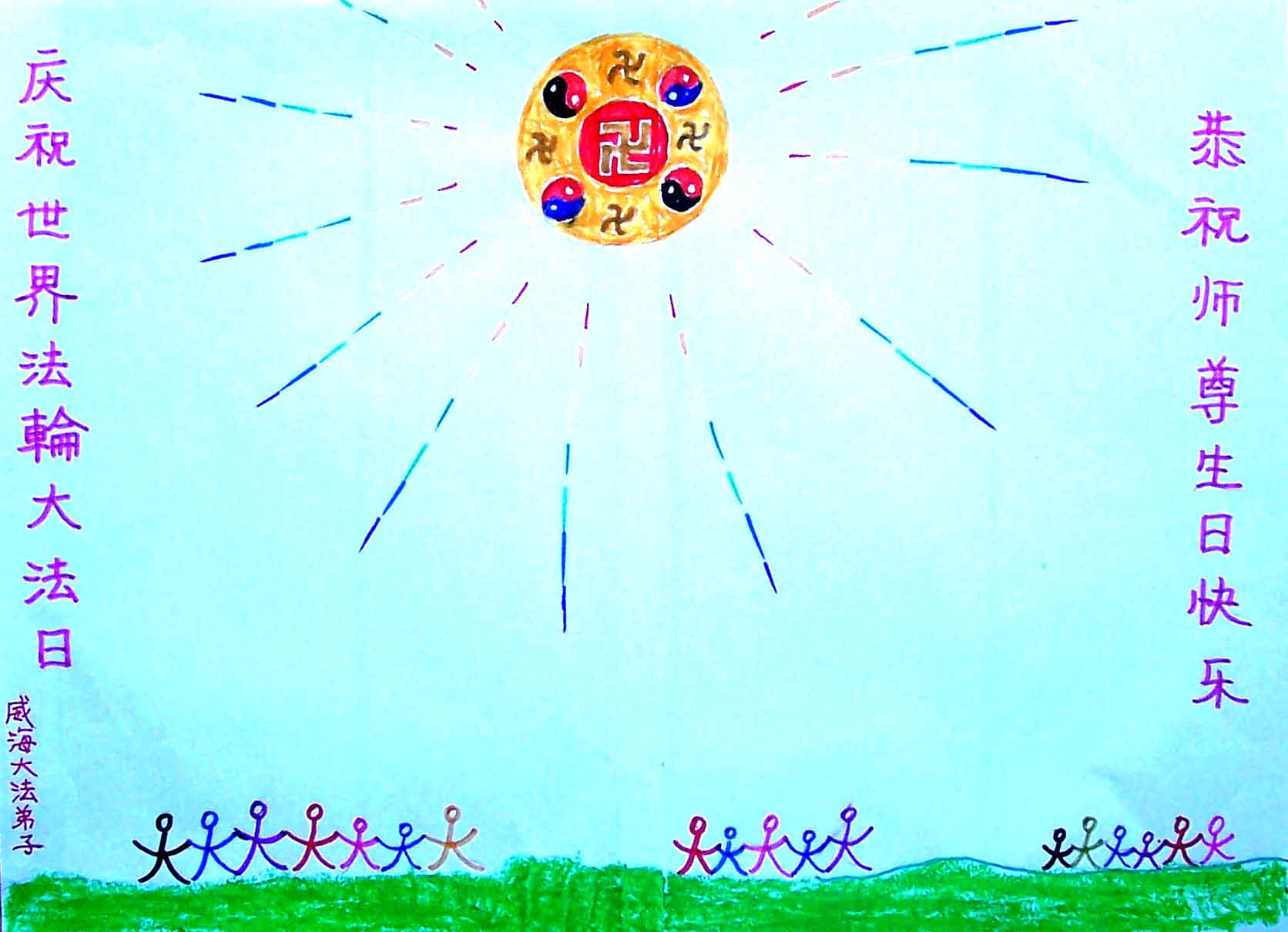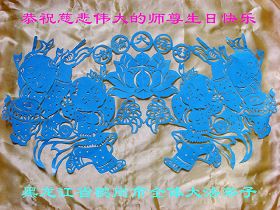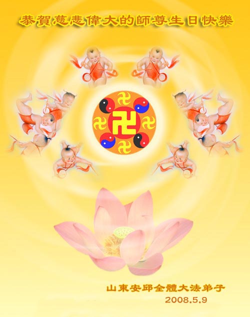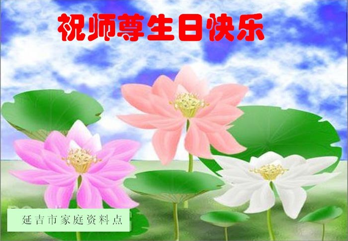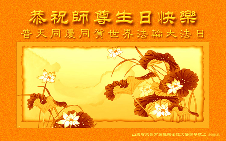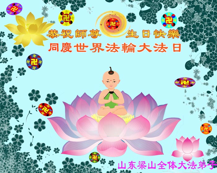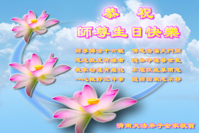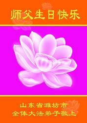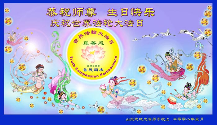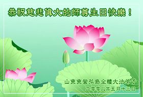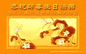 • 山东省胶州市大法弟子一家祝贺世界法轮大法日暨师尊寿辰!