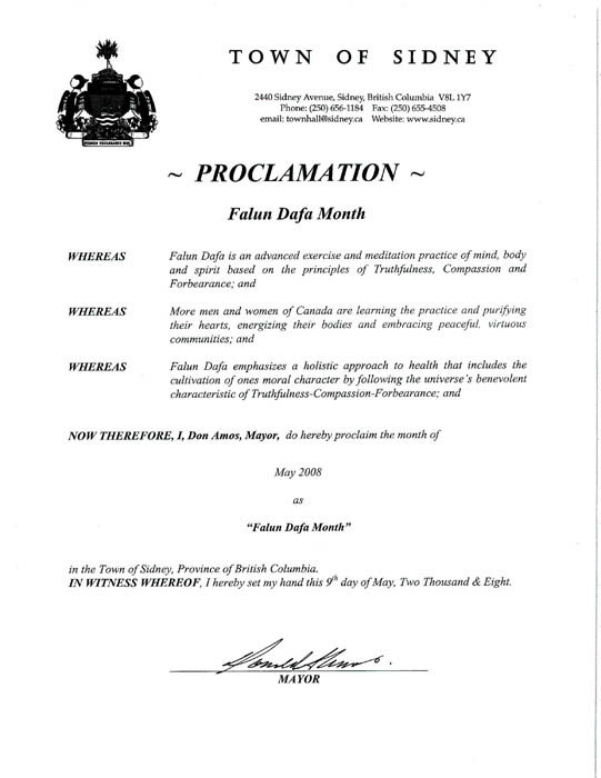 因此,我,镇长唐纳德•阿莫斯(Don Amos),宣布二零零八年五月为不列颠哥伦比亚省(British Columbia)悉尼镇的