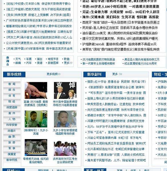 在北京时间二十一日凌晨五点四十分的新华网主页上,可以看到一个计划周密的布局:除了上面悼念的报导,下面的主要位置是多篇继续否认地震前预报的文章,继续撒谎、推卸责任。接下来更是图穷匕现:在中间的“聚焦”和左边的“新华视频”中,均有一则利用纽约法拉盛中共特务组织恶意攻击法轮功学员的事件、反过来栽赃法轮功“捣乱”赈灾活动的报导。