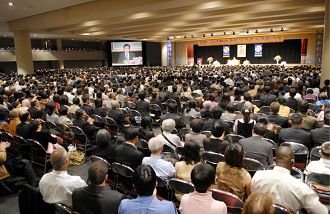 这次法会迎来了五千五百多名来自世界各地的部份法轮大法学员,分别容纳在两个会场。其中十二位学员在法会上发言,他们从神韵演出到“真善忍”画展,从大法弟子办的媒体的销售、日常的工作到“九评点”讲真相等方面,与大家分享了如何在其中修好自己,助师正法的修炼体会。