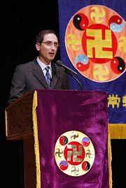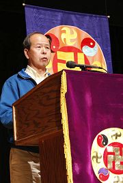 ![]() 神韵艺术团的天音乐团指挥陈汝棠在法会上交流其修炼心得体会。 |