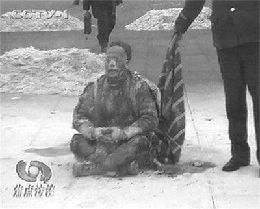 ◇ 报导中说王进东全身烧焦。可是他却还能喊口号,腿中间放着的塑料雪碧瓶居然没有烧坏。这岂不太怪了吗!他的脸部烧得面目全非,而他的头发黑黑的保留了下来。根据常识,人的头发是最容易燃烧的。