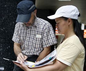 载了一篮子书的刘先生,与游行队伍不期而遇,马上拿出相机,拍下“声援大陆民众退出共产党”的旗海,他说要把这个讯息贴到维基百科上,虽然维基百科被中共封锁,他希望中国大陆民众能突破封锁看到这样的讯息。