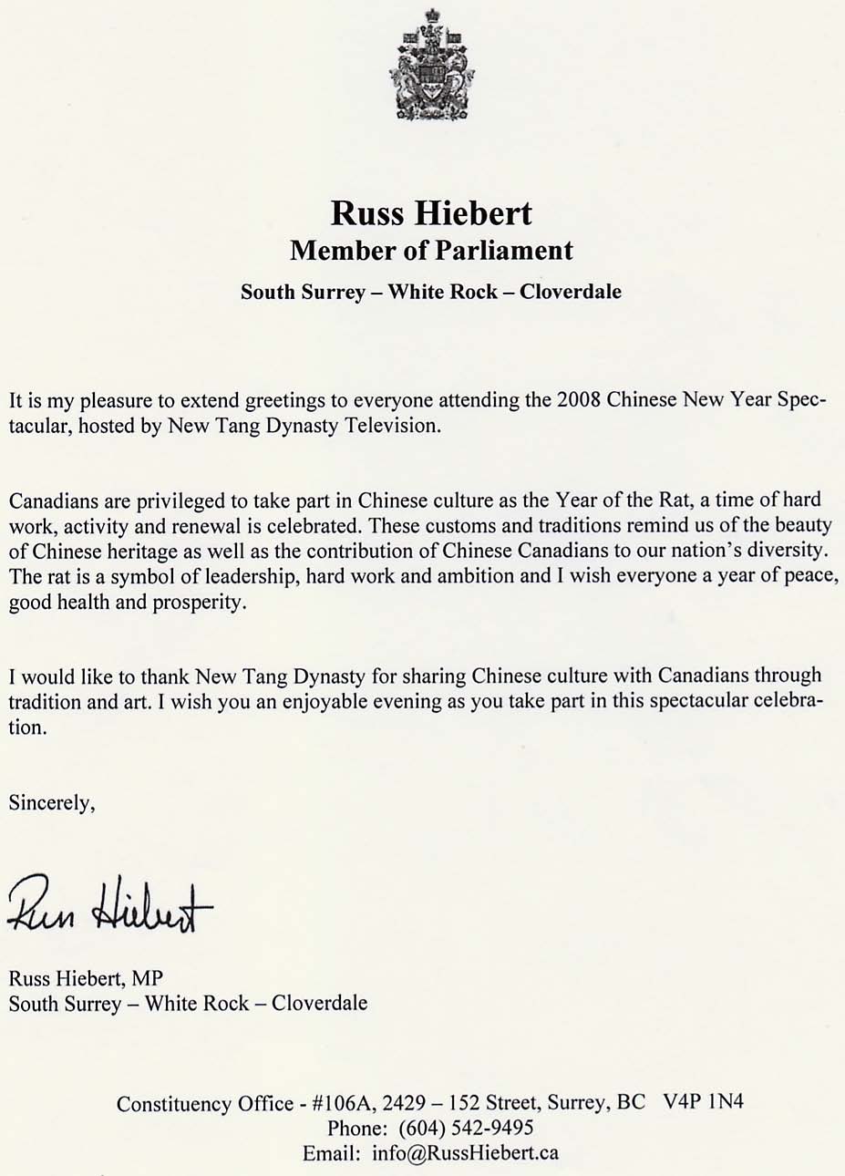 South Surrey区的国会议员Russ Hiebert表示:“我很高兴的向每一位出席由新唐人电视台主办的二零零八年中国新年晚会的成员表示问候。我在此感谢新唐人与加拿大人分享中国的传统文化和艺术,我祝愿你们在观赏晚会的同时有一个美好的夜晚。”