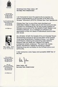 本那比-新西敏(Burnaby-New Westminster)的国会议员Peter Julian的贺信表示:“我感到很荣幸能借此机会向新唐人电视台举办的神韵新年晚会表示衷心的祝贺。我并祝愿大家新年愉快,鼠年万事如意。”