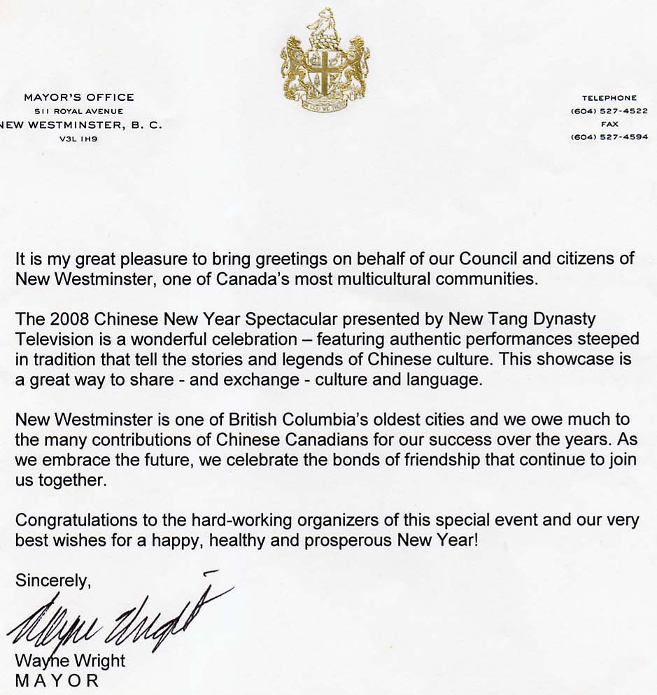 新西敏市市长Wayne Wright发信祝贺:“我非常荣幸的代表加拿大多元文化社区之一的新西敏市市议会及市民表示诚挚的祝愿。新唐人电视台主办的二零零八年神韵晚会是一台出色的演出,通过纯正的传统表演技法把中国文化中的传说故事表现出来,是一次独特的文化语言交流。”