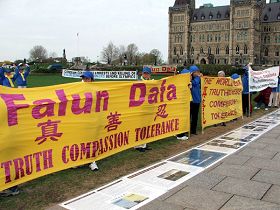 五月二日,近百名来自加拿大东部城市的法轮功学员在加拿大首都国会山前集会,并摆设反酷刑展、真相图片展等方式,向加拿大政府和民众讲述发生在中国的迫害。