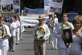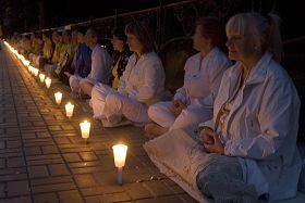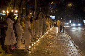 活动期间,法轮功学员们还在中使馆前举行了烛光守夜活动来悼念那些被中共迫害致死的同修,并呼吁制止中共对法轮功的迫害。