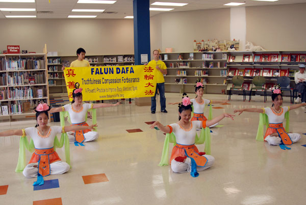 示范五套功法时,另有学员解释什么是法轮功,介绍自己从中亲身受益的经历;接着是由穿着仙女服的几位学员表演莲花舞,她们优雅的舞姿、伴着动人的音乐吸引了人们的目光,人们对表演报以热烈的掌声;接着一学员独唱了歌曲《为你而来》,并在演唱前,为观众介绍了这首歌曲的缘由,让聆听的民众为之动容。之后,更应当地电视台记者要求,学员再一次表演莲花舞。表演后,有民众表示想学习法轮功,当场有人在摊位后的舞台上学习,也有人表示会来炼功点学习。
