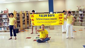 法轮功学员今年表演的节目除了功法演示外,女学员们还表演了莲花舞,一名西人学员独唱了由法轮功学员创作的歌曲。