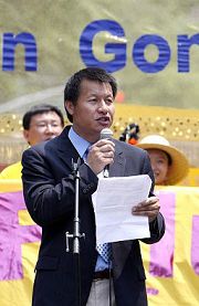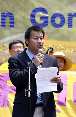 ![]() 全球退党服务中心的代表李大勇博士在集会上发言 |