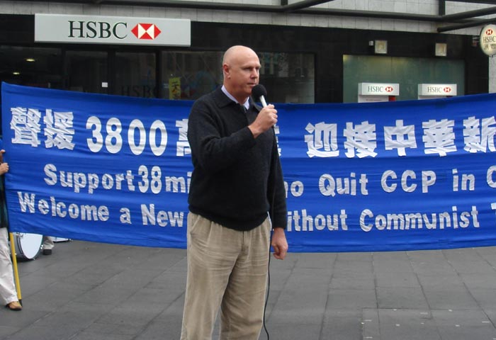 澳洲法轮大法佛学会发言人约翰•戴乐在集会上发言,介绍了法轮功是什么及中共发动这场大规模的镇压运动,导致数千名法轮功学员被迫害致死。九年过去了这种迫害还在继续着,全球的法轮功学员面临巨大的压力,保持大善、大忍,不断的向世人讲真相,目前已有三千八百万明白真相的人们退出中共及其体系。最后他说:“我想在大家了解到真相后,你就有责任告诉你身边的人中国发生的真实情况。”