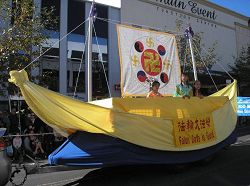 法轮功学员的方阵由四个方阵组成。天国乐团、古装仙女、花车和腰鼓队迎来了道路两旁市民们的热烈掌声。在主席台上,主持人向人们介绍了法轮大法洪传于全世界八十多个国家和地区,有一亿人按照“真、善、忍”在修炼。
