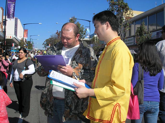 游行结束后,部份学员在主席台对面的摊位上炼功,发真相资料。一些市民纷纷签名,要求中共立即停止迫害、释放法轮功学员。