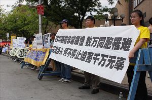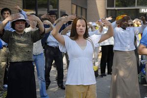 他说,这些天他看到在法拉盛有年长的炼法轮功的老阿姨举着横幅,有年轻的,还有只有十来岁的孩子,都很平和。好象不同年龄的人都能炼。他也看到还有很多外国人在炼法轮功,相信这是一个很好的功法。
