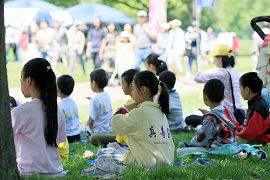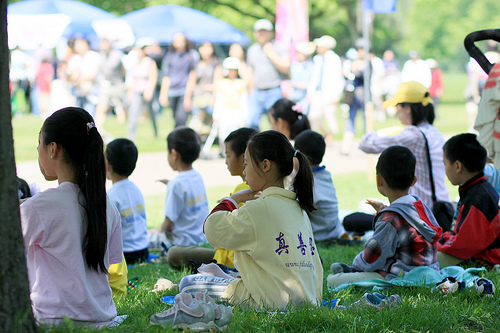 明慧学校的法轮大法小弟子们主要以炼功的形式洪法。他们在草坪上打坐炼功时,吸引了很多游人的目光,人们纷纷停下来拍照和观看。
